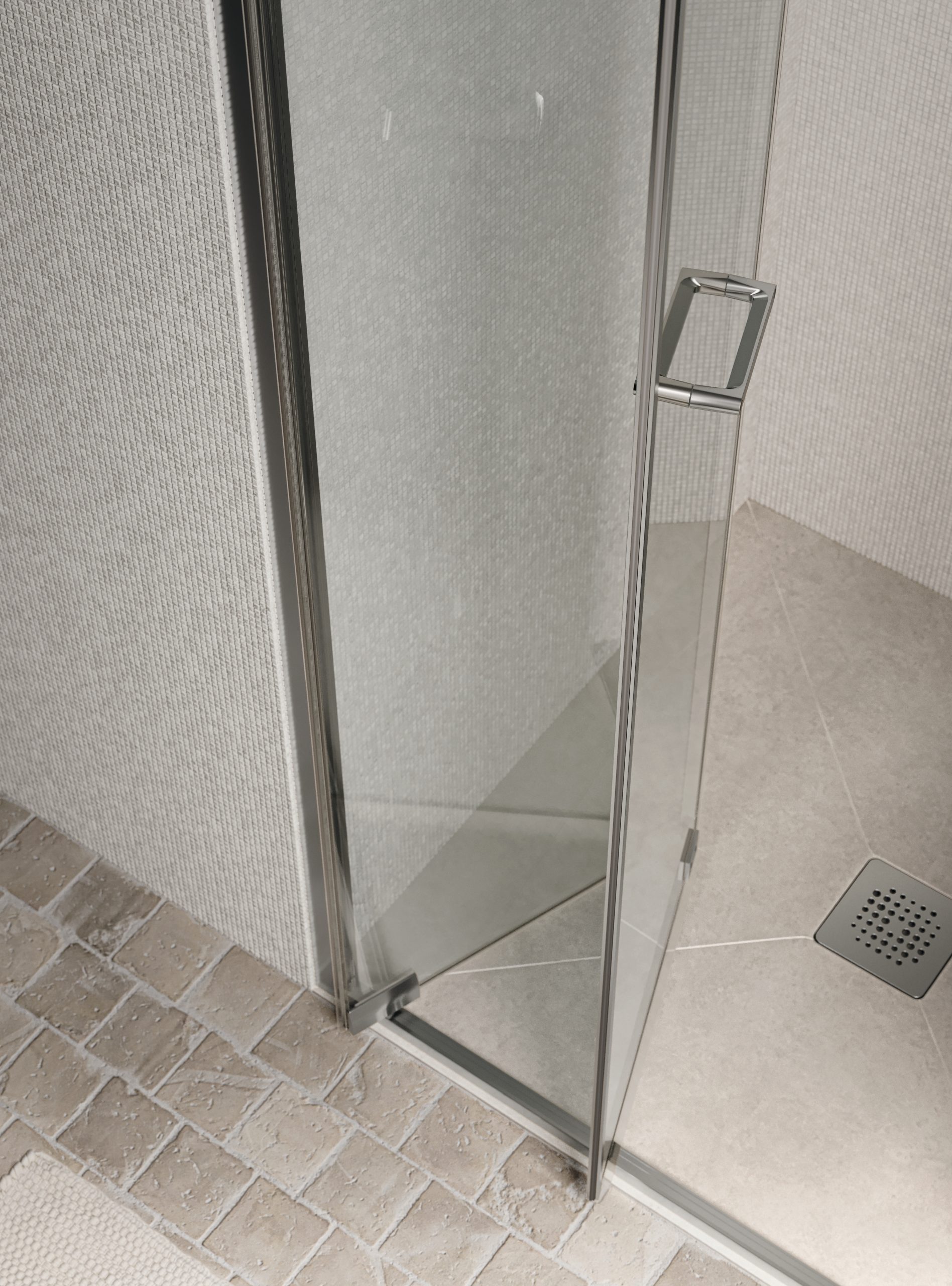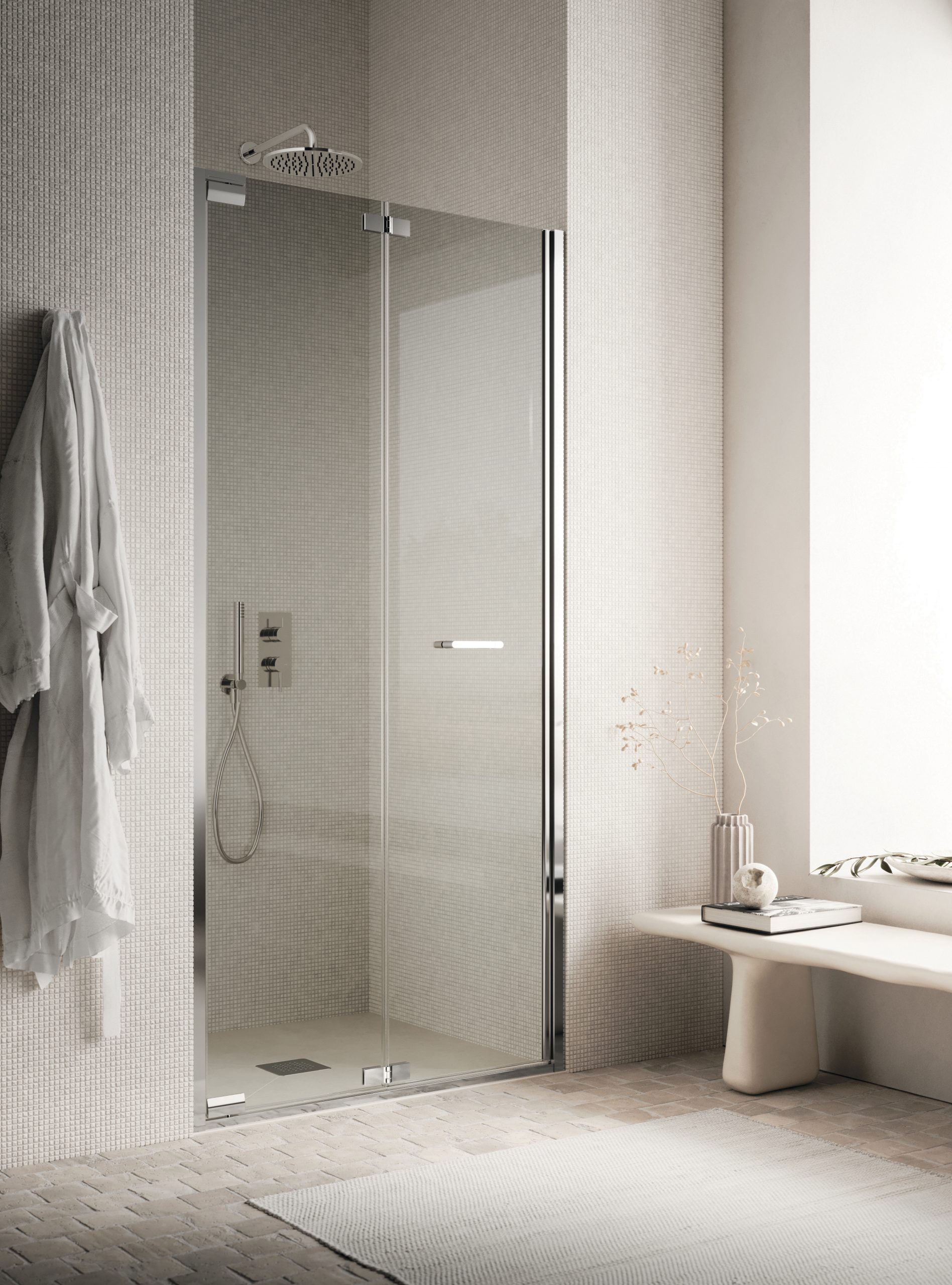 Il box doccia Zefiro Light nella sua configurazione ad anta pieghevole rappresenta la sintesi perfetta tra ottimizzazione degli spazi, design e minimalismo. Caratterizzata da un’estetica pulita e ariosa, questa variante non dispone di traversa superiore, accentuando ulteriormente il senso di leggerezza visiva. Il vero cuore tecnologico ed estetico è la nuova maniglia orizzontale a passo ridotto: non un semplice accessorio, ma un elemento progettato per integrarsi armoniosamente con le linee minimaliste del vetro. La forma ergonomica offre una presa sicura e ferma, trasmettendo una sensazione di robustezza immediata.