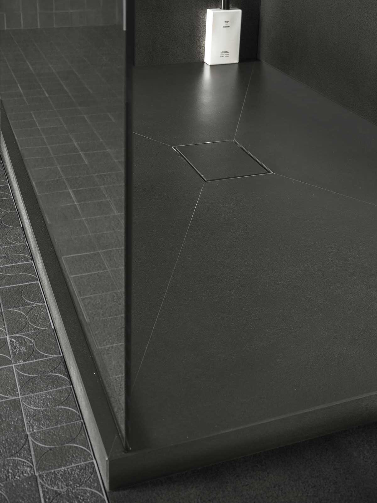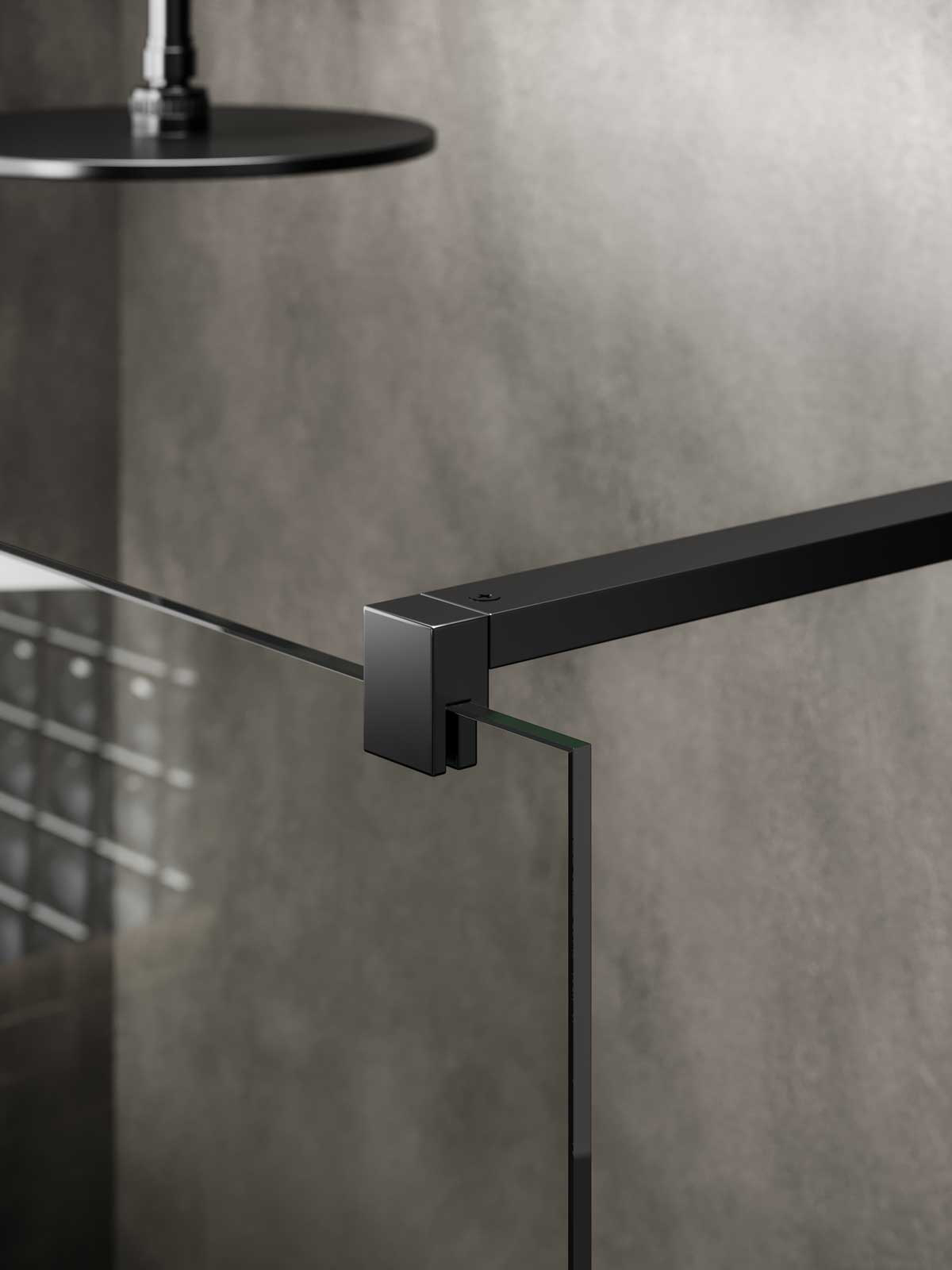 Vetro in appoggio su piatto doccia, profilo inferiore sotto vetro su richiesta, finitura come profilo a muro.