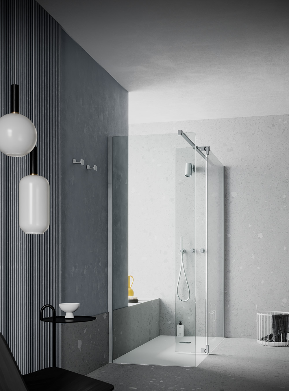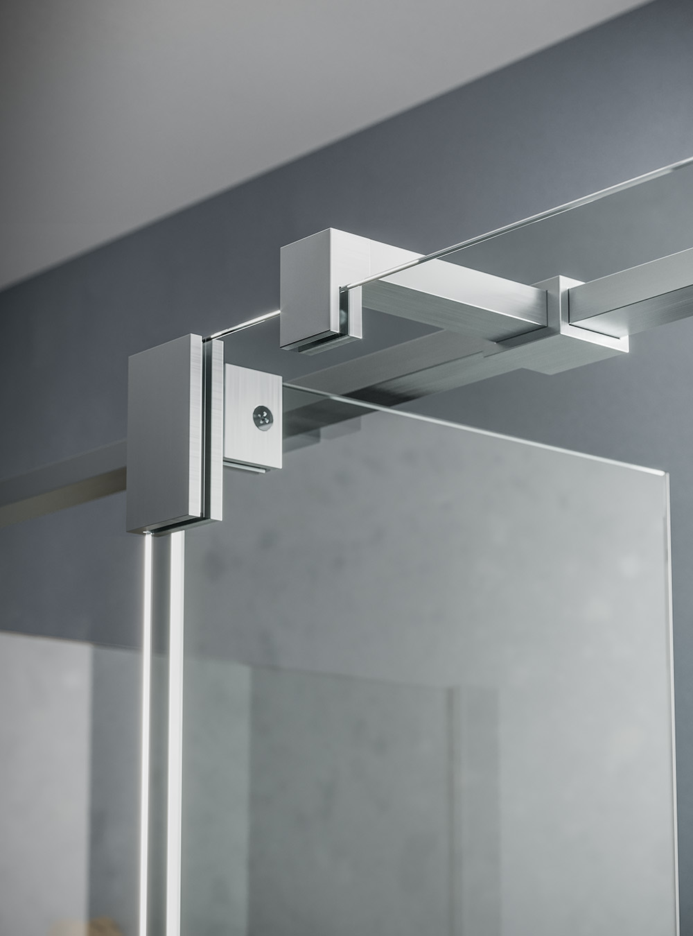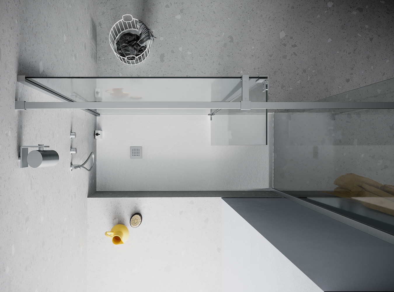 Vetro in appoggio su piatto doccia, profilo inferiore sotto vetro su richiesta, finitura come profilo a muro.