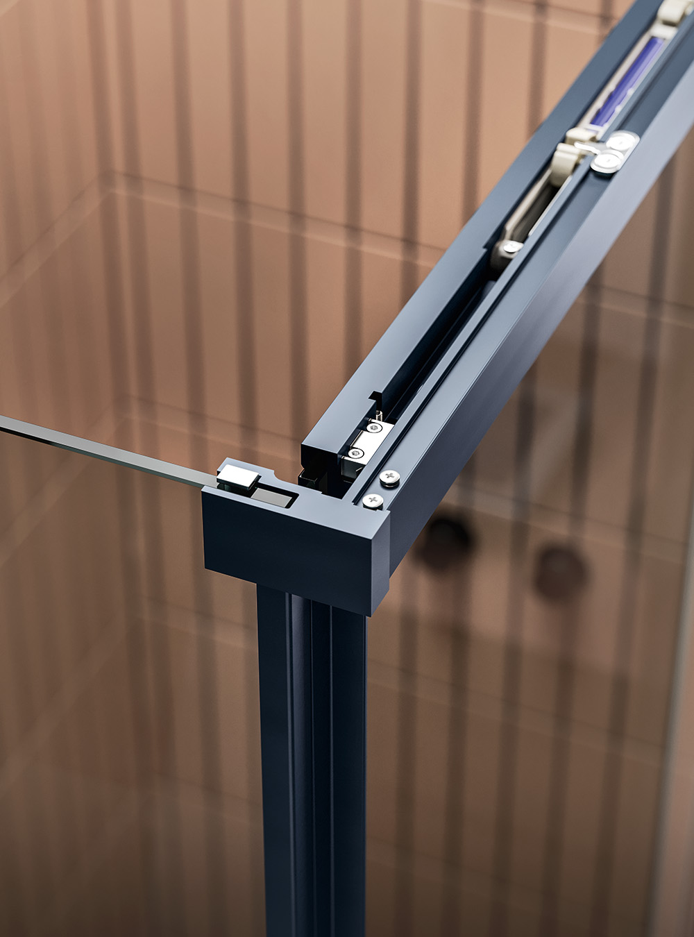 Nella versione a due ante scorrevoli i profili sono tagliati a 45° per una giunzione minimale.