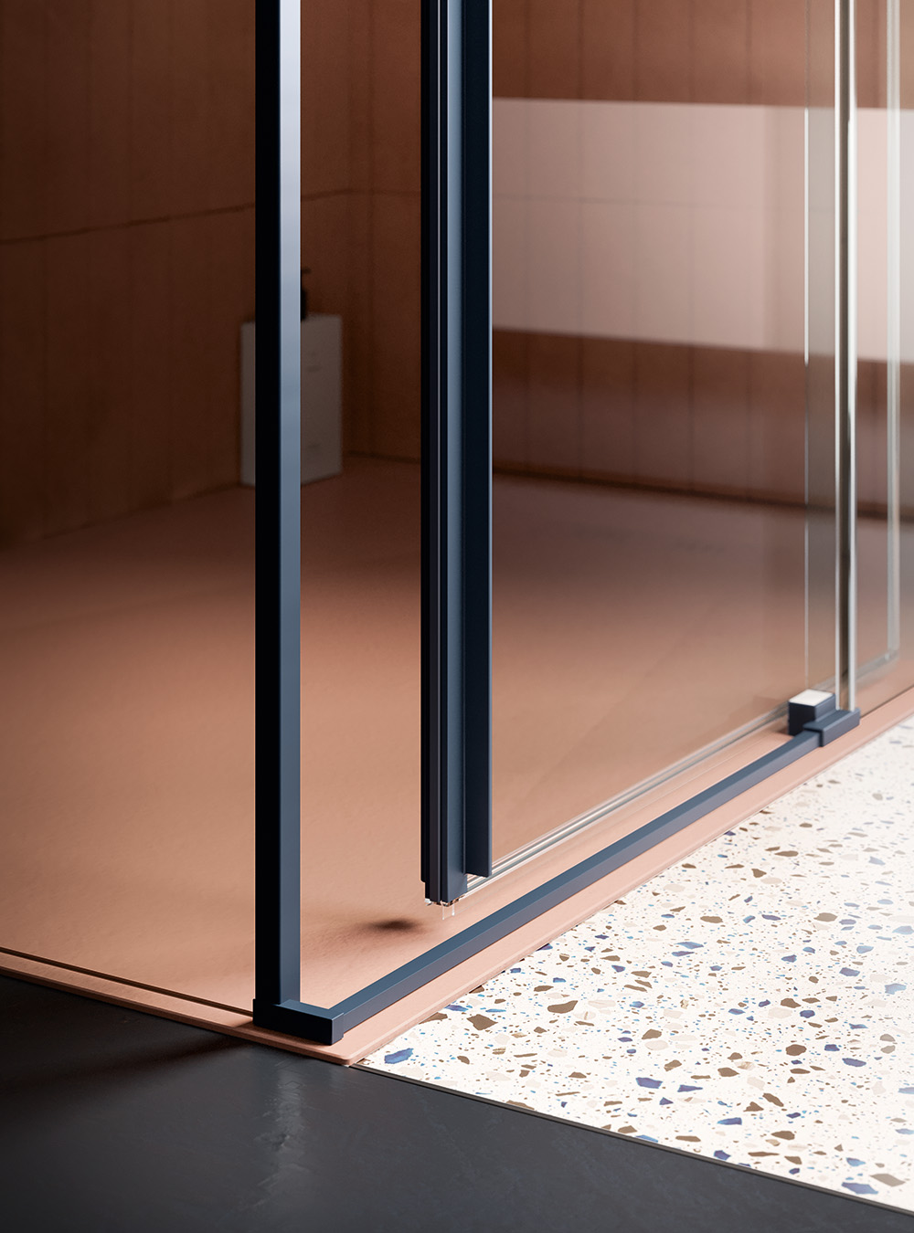 Sgancio rapido della porta, soft close di serie, traversa con taglio a 45°, guarnizione magnetica.